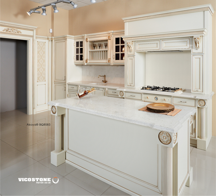 Mặt bàn bếp với đá nhân tạo VICOSTONE Akoya BQ8583 theo phong cách cổ điển